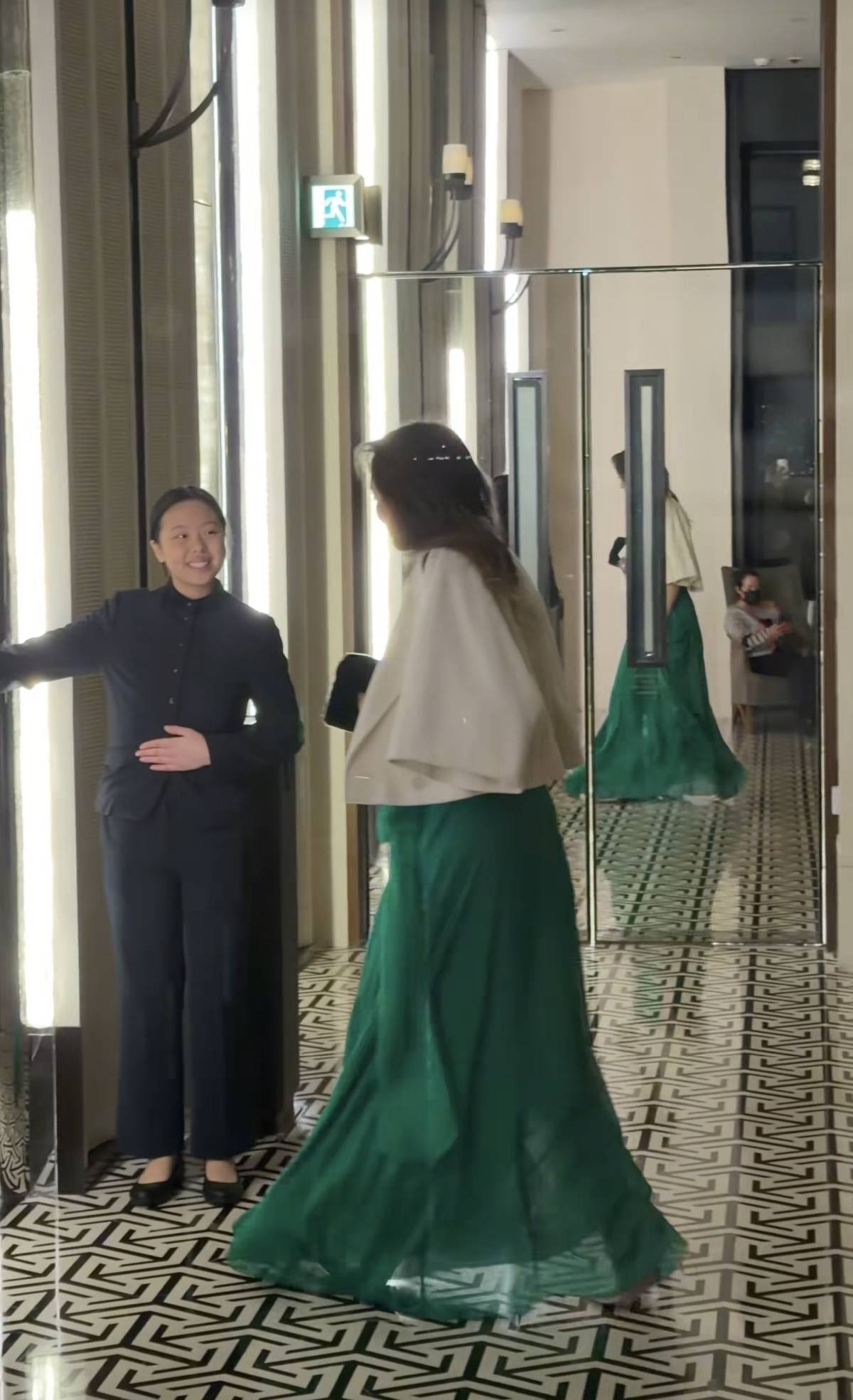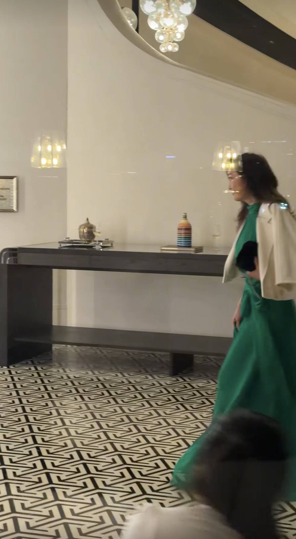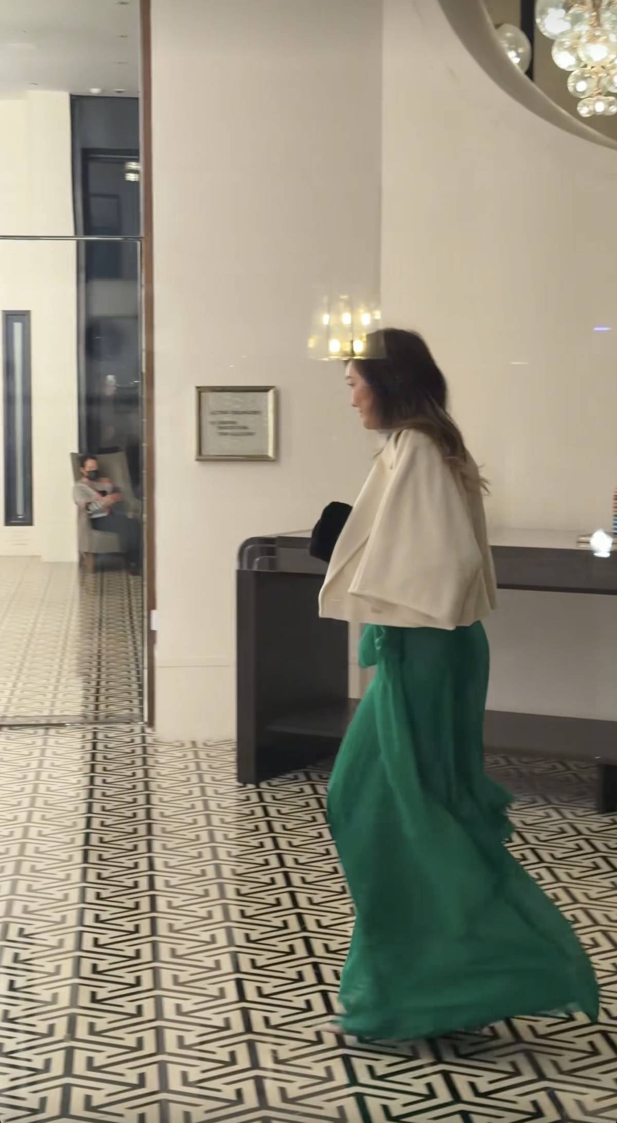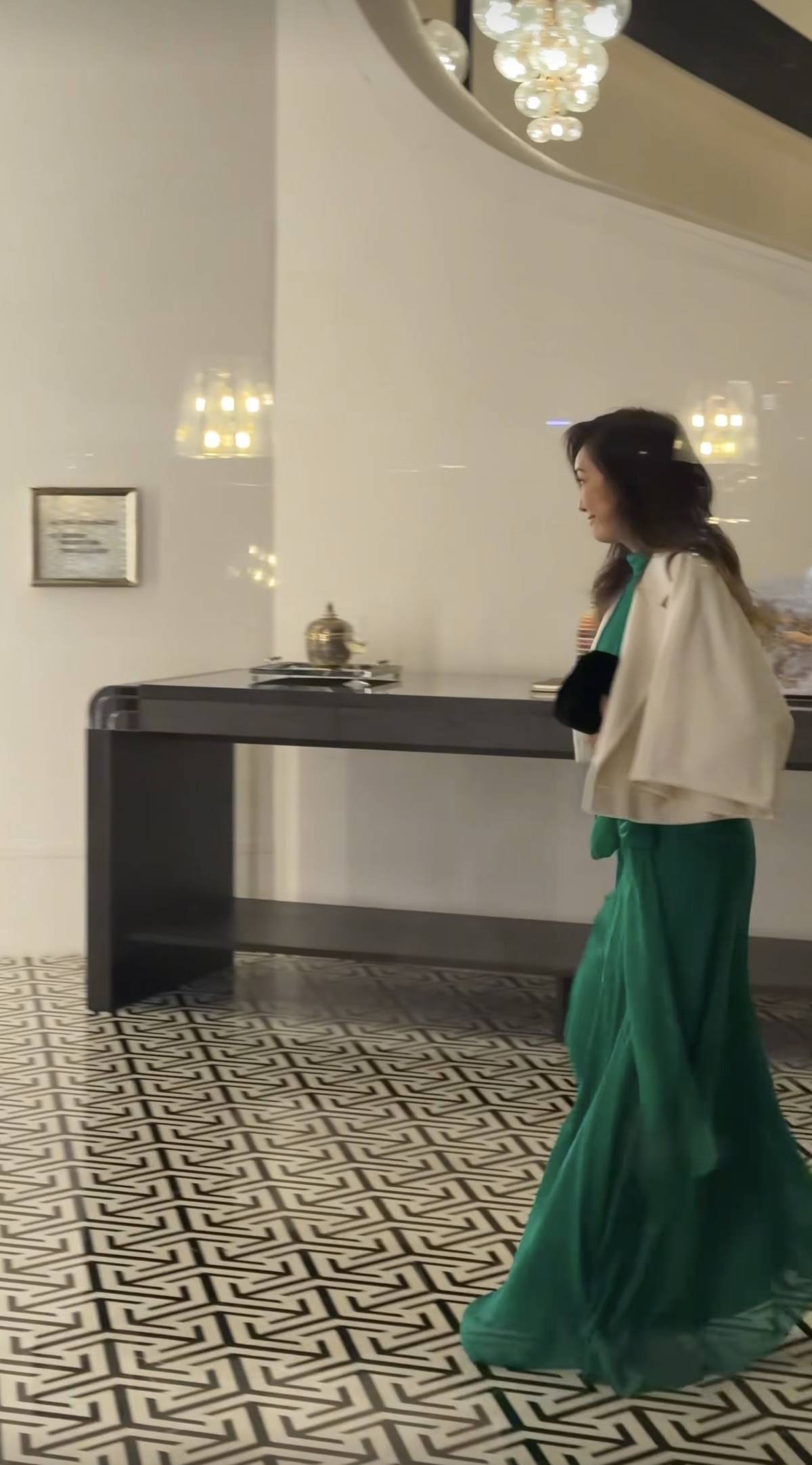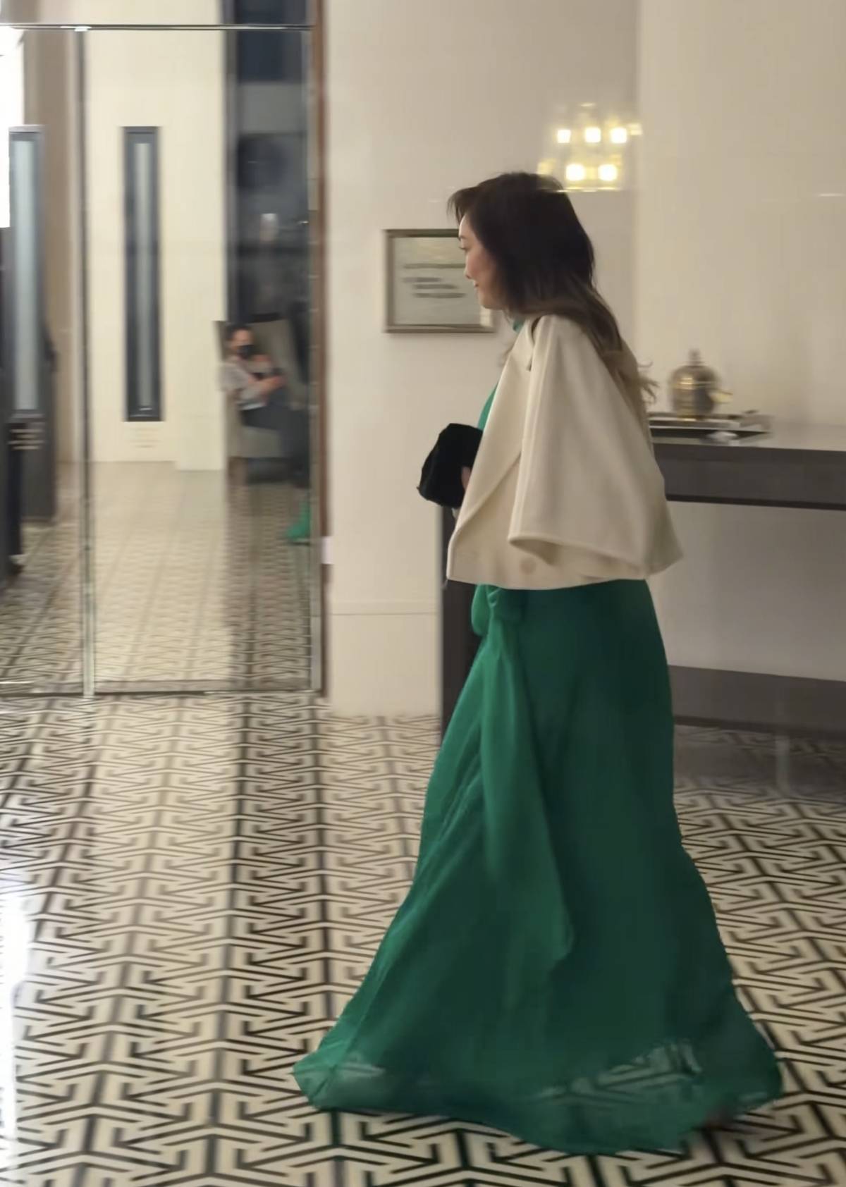孟广美头发剪短了,穿了一件绿色的丝质拖地长裙子,上身穿了一件白色的短外套,脚上是一双厚底的高跟鞋,手里握着一款黑色的名牌包包,小心翼翼往前走。